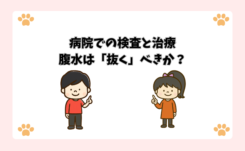 そして治療方針を決める際、飼い主さんが最も悩み、獣医師と相談しなければならないのが**「腹水を抜くかどうか」**という問題です。